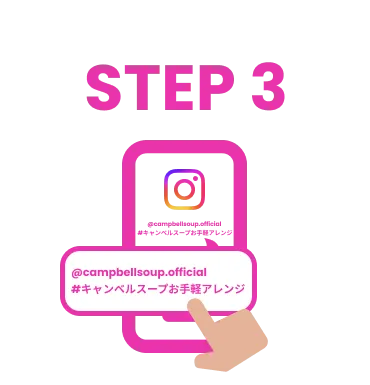 - ご本人様のInstagramアカウントで〈キャンベルスープ公式Instagramアカウント@campbellsoup.official〉をフォローし、応募期間内に指定のハッシュタグを付けて、自作のオリジナルレシピの写真または動画を投稿してください。(ストーリーズ投稿は対象外となります。)